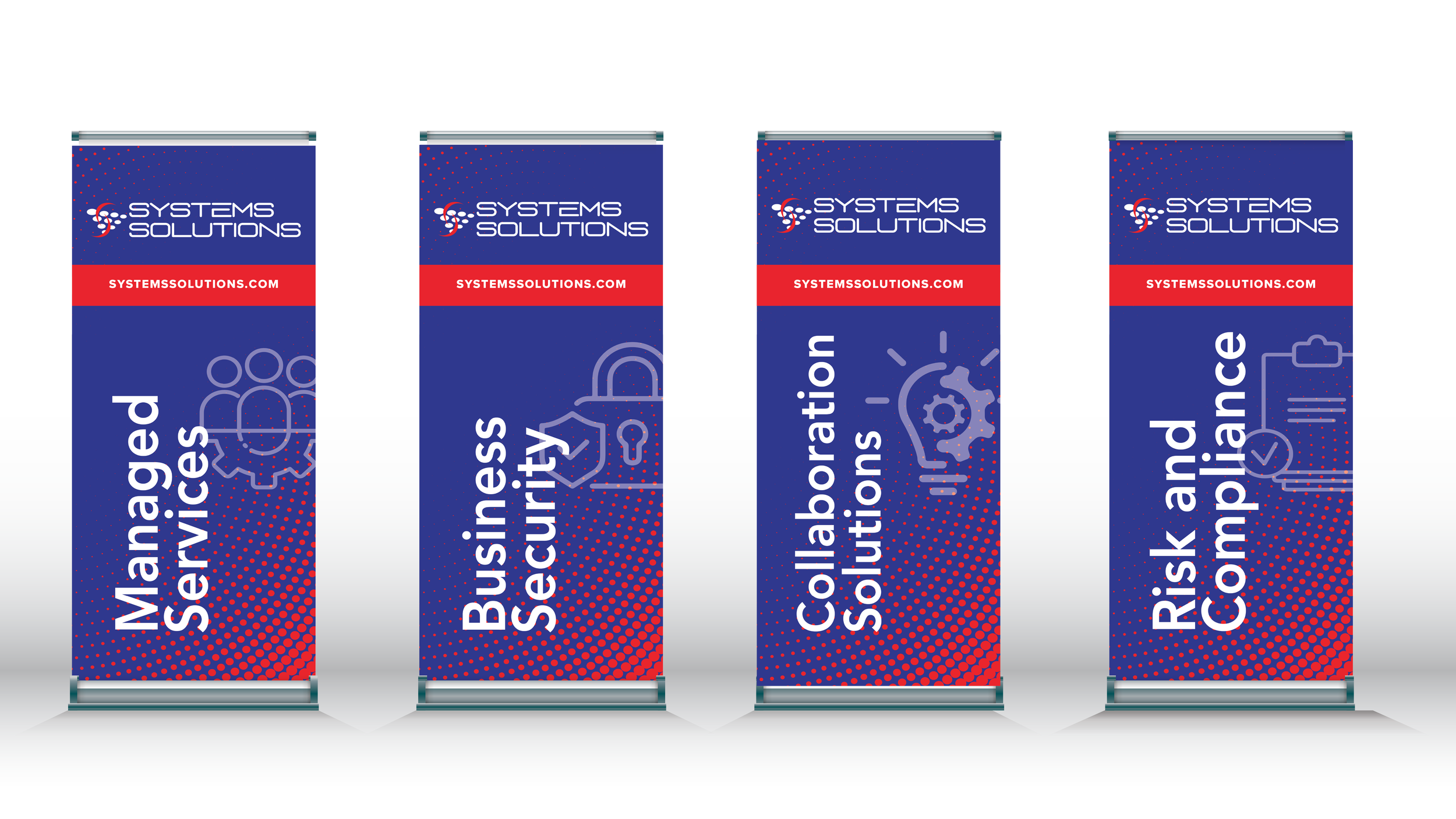 New Charter Tech Signage – Designed custom stand-up banners featuring branding and welcome messages, alongside Systems Solutions banners that highlight key services.